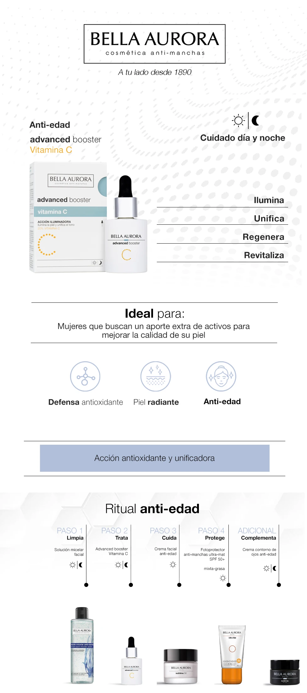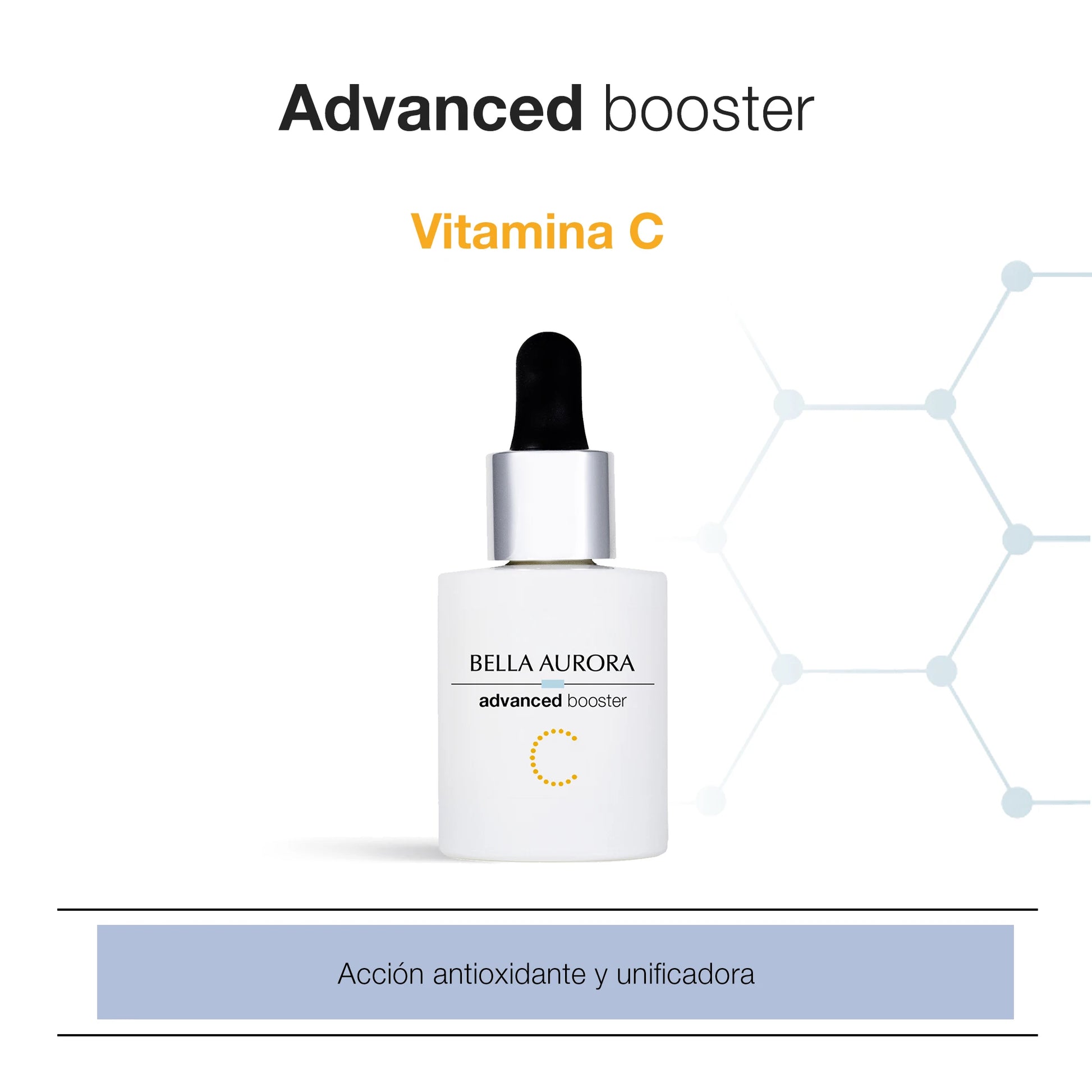 El Booster Avanzado Bella Aurora con Vitamina C es un serum facial antioxidante de alta concentración que ilumina, unifica el tono y protege tu piel contra los daños causados por radicales libres. Su fórmula intensiva actúa rápido para mejorar la textura y el brillo natural del rostro.