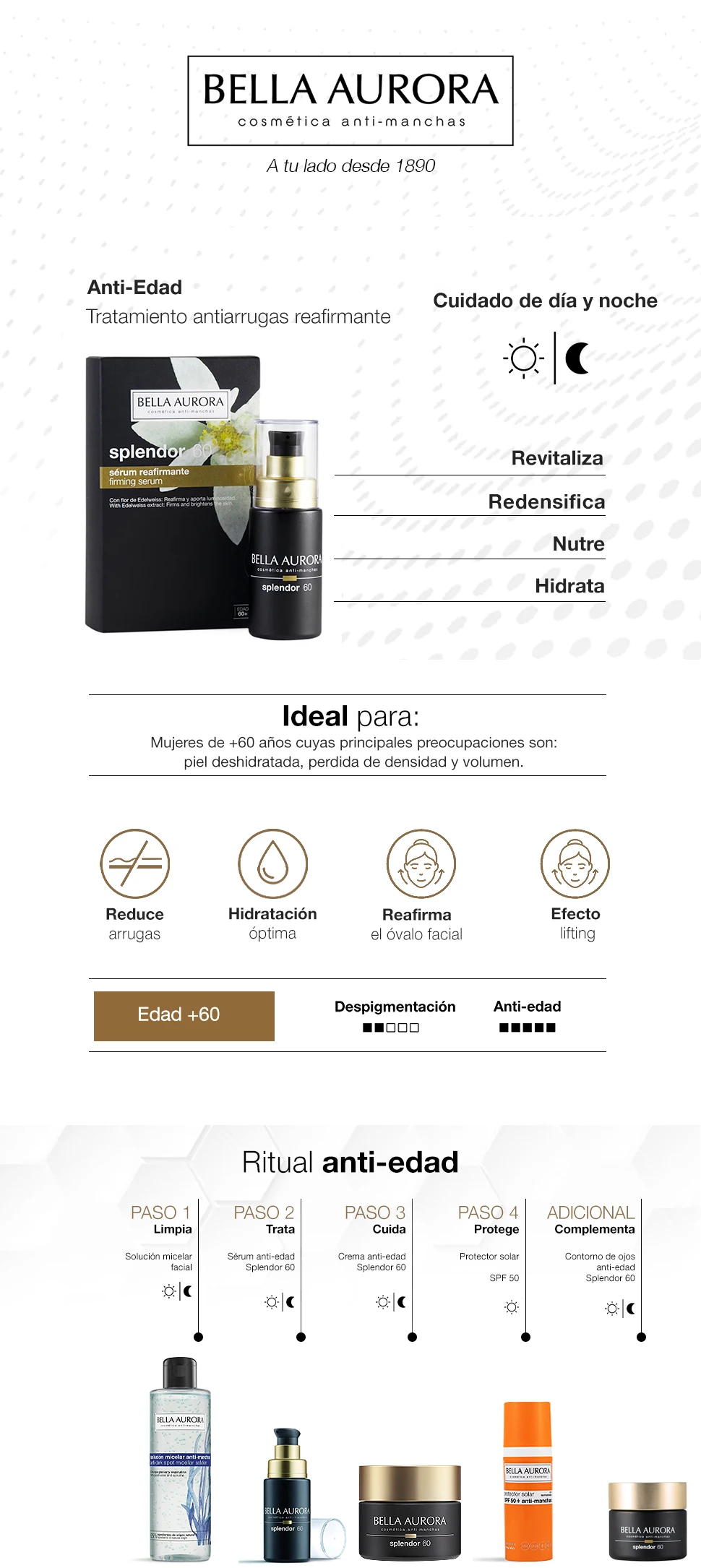 Bella Aurora Splendor +60 Sérum Reafirmante 30ml – Antiarrugas, Antimanchas y Efecto Lifting