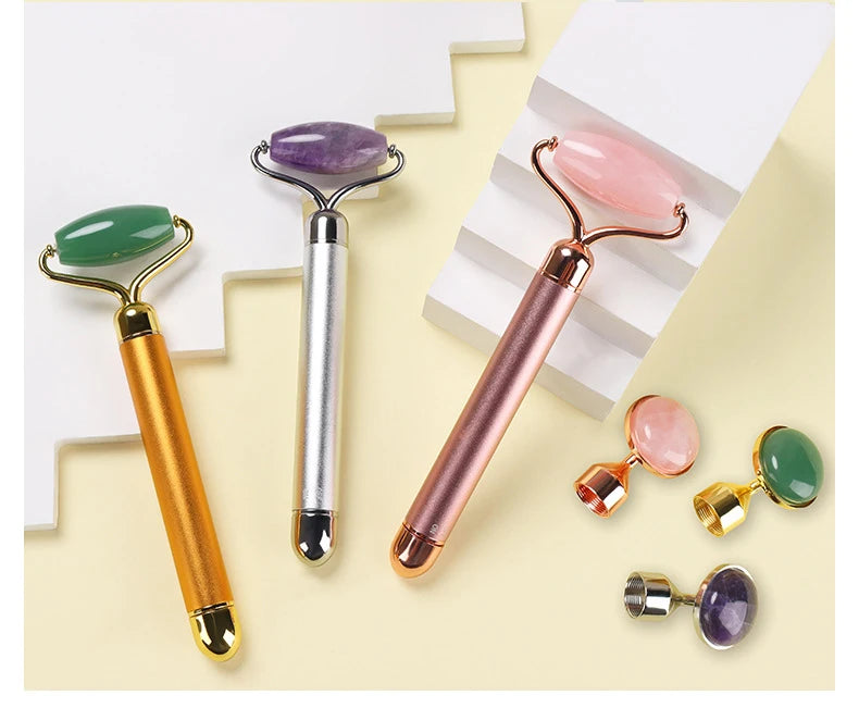 Rodillo Facial Eléctrico Vibratorio 2 en 1 de Cuarzo Rosa y Jade Natural – Lifting y Masaje Rejuvenecedor