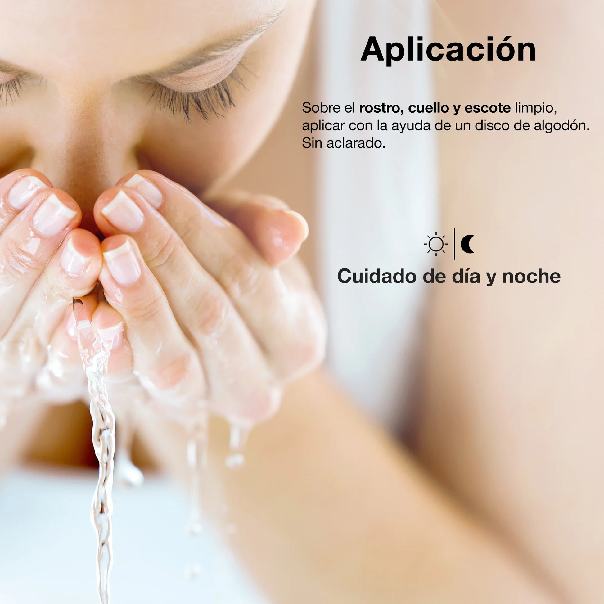 Instrucciones de uso: sobre un rostro, cuello y escote limpios, aplique con la ayuda de un disco de algodón. Sin enjuagar.